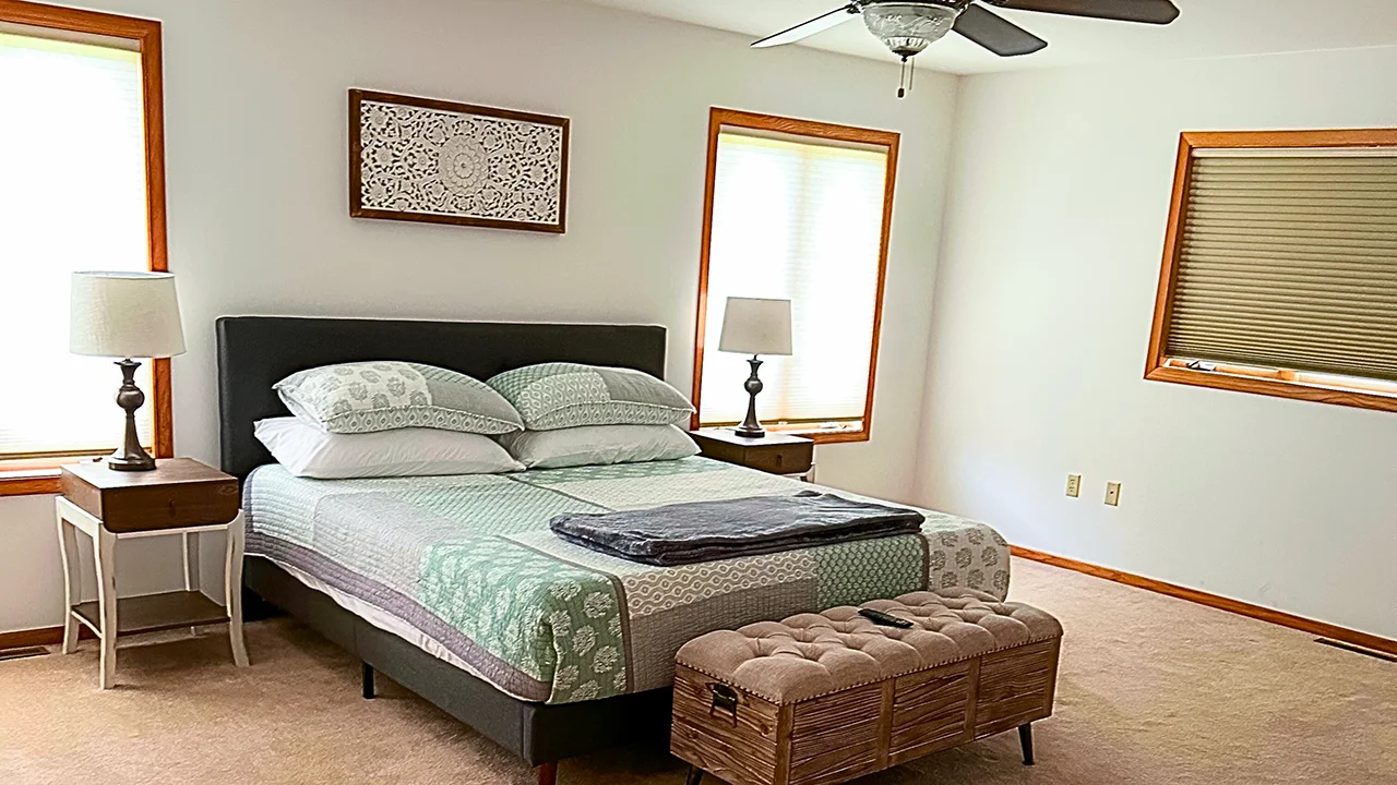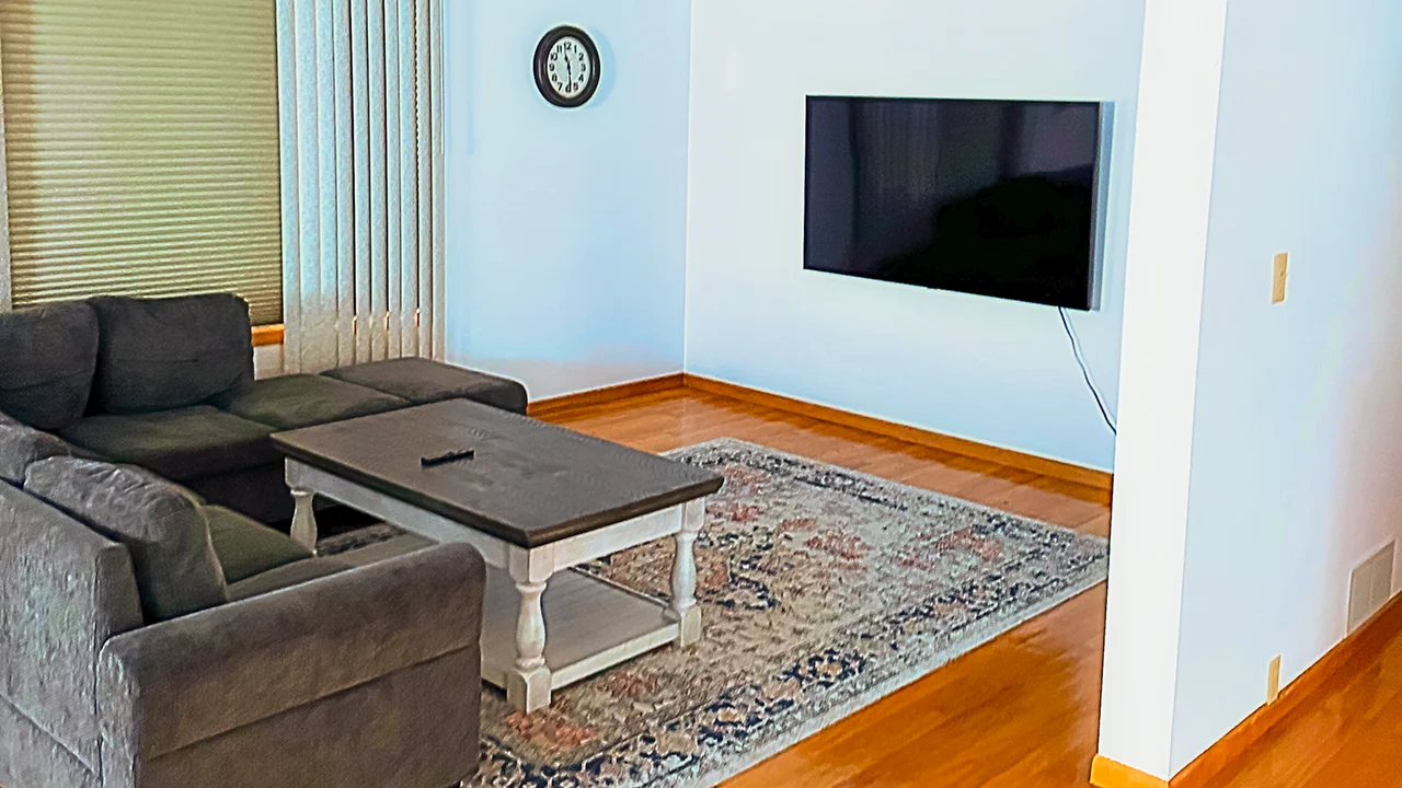 Inside, the space is welcoming and practical, designed for spending time together. The living area is cozy and bright, with a large sectional sofa, a 65-inch TV, and plenty of natural light from the windows overlooking the lake. It’s a great spot to relax after a day on the water or gather for movie nights.